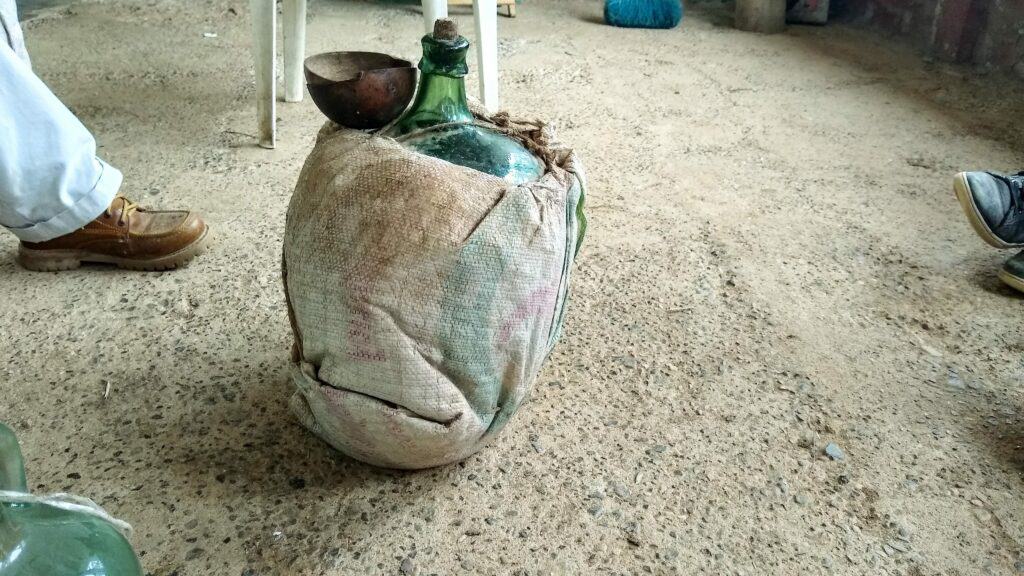 We’re sitting in folding chairs on the cement porch of his home, surrounded by gunny sacks of corn. A full damajuana, the big glass jug traditionally used to haul raicilla from the country for sale in town, sits center stage.